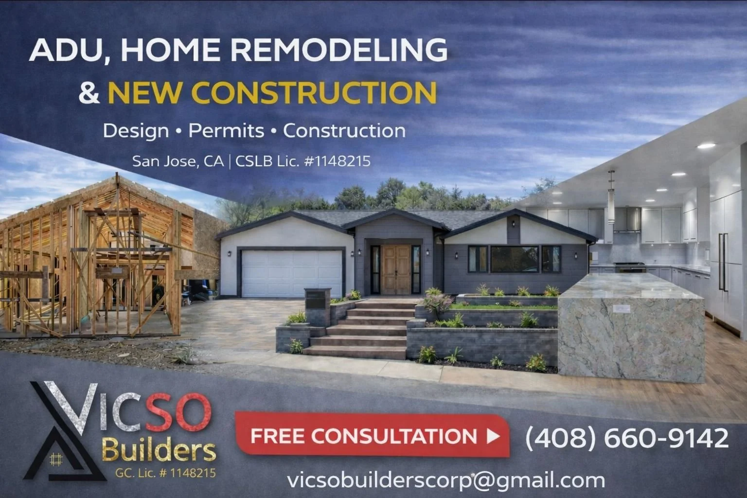 VICSO Builders Corporation is a fully licensed construction company specializing in Accessory Dwelling Units (ADUs), home remodeling, and new construction. Serving the Bay Area and surrounding communities, VICSO Builders is known for delivering high-quality craftsmanship, reliable project execution, and a strong commitment to customer satisfaction. Their team brings experience, professionalism, and attention to detail to every project, supporting homeowners from concept through completion.